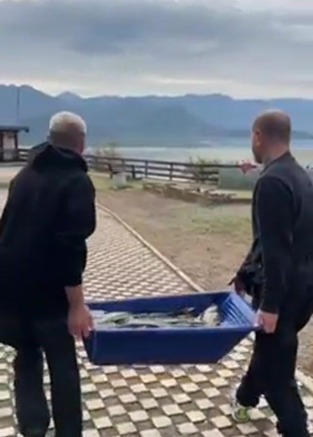 Two men carry a blue plastic tub full of fish. They walk on a brick path towards a lake and mountains in the background. The sky is cloudy. The man on the left wears a black hoodie and black pants. The man on the right wears a black long-sleeved shirt and black pants.