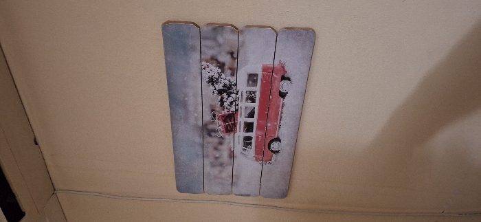 The image depicts an interior wall in Burgas, Bulgaria, featuring a multi-panel wall hanging. The wall itself is a plain, light beige or off-white color with a subtle textured finish. In the upper left corner, a portion of a white air conditioning unit or similar rectangular appliance is visible, mounted near the ceiling. A white electrical cable runs vertically along the wall seam from the upper left, then horizontally to the right, partially obscuring the upper left corner of the wall hanging. The central subject is a rectangular wall hanging composed of four horizontal wooden or wood-effect slats, collectively forming a single image. The image printed on these slats portrays a red and white vintage-style van, specifically resembling a Volkswagen Type 2 bus, positioned on a snow-covered ground. The van is depicted facing right, with its left side visible. On the roof of the van, a green, snow-covered Christmas tree is secured, along with two stacked red gift boxes tied with white ribbon. The background of the image shows a blurred, snowy landscape under a cloudy or overcast sky, with visible falling snow. No people are present or engaged in any actions within the frame. The scene is illuminated by ambient interior light, casting a faint shadow from the wall hanging onto the wall to its lower right.