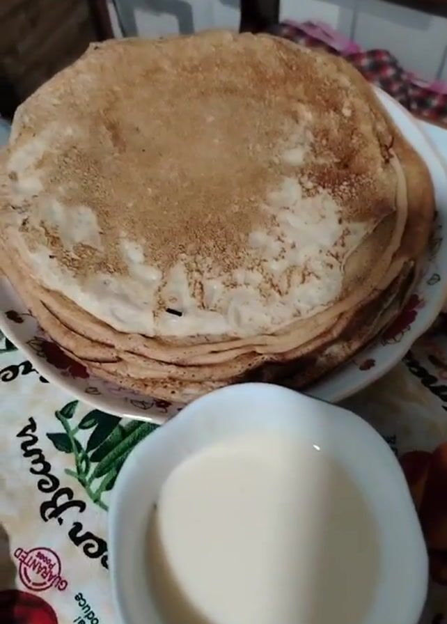 The video displays a table laden with a variety of food items. At the center, a stack of pancakes rests on a white plate with a floral design. Beside the pancakes, a small white bowl contains a light-colored liquid, potentially condensed milk. A dark-colored jam or preserve sits in a decorative bowl with a patterned rim. Other food items include what appears to be sliced melon and wrapped chocolate bars in a glass bowl. The table is covered with a tablecloth featuring a pattern of vegetables and text. The setting seems to be indoors, with a glimpse of a wooden chair and wall in the background.