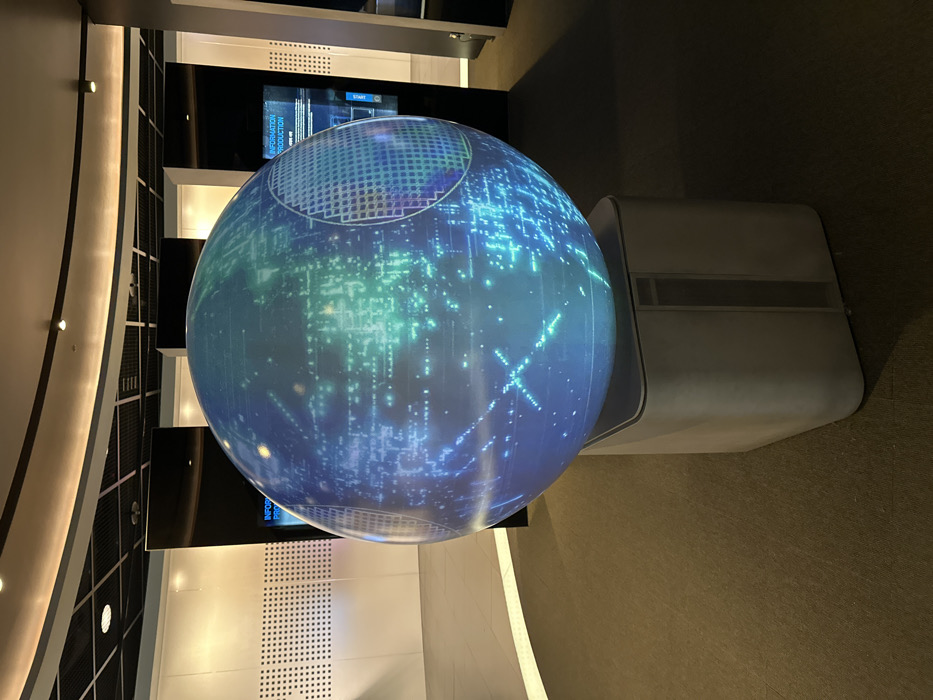 An indoor photograph displays a large, illuminated spherical projection screen centered within an exhibition space