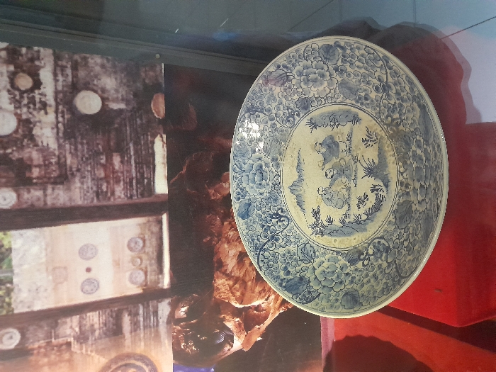 blue and white porcelain plate with a floral design, featuring a depiction of three people. The plate is displayed on a red velvet surface within a glass case. The plate is located in a museum, possibly in the town of Kecamatan Buduran, Indonesia, which is situated at approximately -7.434 latitude and 112.72 longitude. The case is framed by a wooden frame and a gray glass door, suggesting a museum exhibit. The scene is lit by artificial lighting.