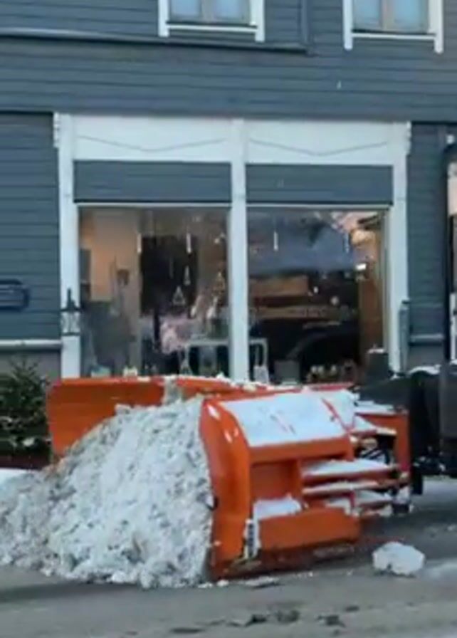 An outdoor scene shows a yellow Volvo loader with an orange snowplow attachment pushing snow to the side of a road
