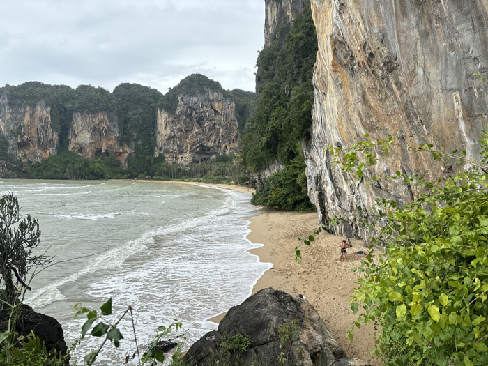 The image displays a panoramic view of Phra Nang Cave Beach in Ao Nang, Krabi, Thailand, under an overcast sky. A curved sandy beach spans the midground, bordered by choppy, greenish-grey ocean water with white breaking waves. To the right, a large limestone karst rises vertically, exhibiting distinct grey, tan, and white striations and partial green vegetation cover. In the background, a series of smaller, heavily vegetated limestone karsts define the bay. Two individuals are positioned on the sandy beach near the base of the right karst: one standing figure in dark shorts and a lighter top, and one figure kneeling or sitting beside a dark, indistinct object. Lush green foliage and dark rocks occupy the immediate foreground, partially framing the scene.