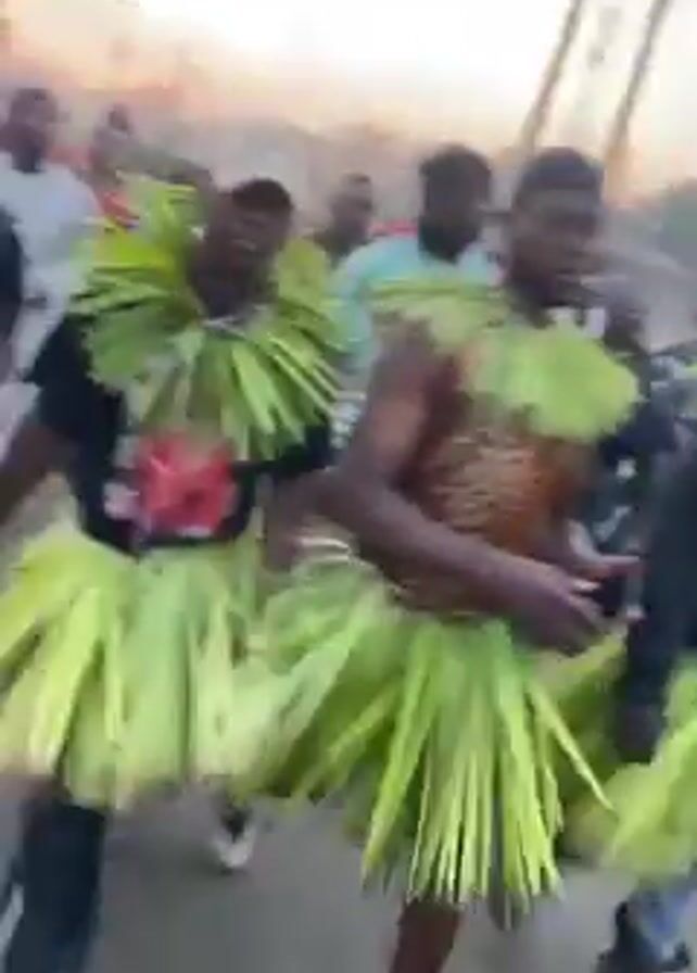 A group of about 10 young men are walking down a road, dressed in traditional clothing. They are wearing skirts made of green palm fronds and some are wearing additional shirts with patterns on them. Some of the men are smiling and dancing. The environment appears to be a village or small town, with trees and buildings visible in the background. Smoke is visible rising in the distance.
