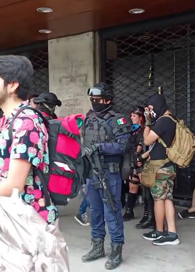 crowd of people in costume standing on a sidewalk outside a building. Some people are dressed in anime or cartoon character costumes. Some are standing or sitting against a closed metal gate. Two people dressed as police officers stand among the crowd. The officers wear dark blue outfits, helmets, goggles, and black face coverings, and one carries a rifle. A few people walk by on the sidewalk. The building's overhang is dark brown. The sidewalk is made of concrete.