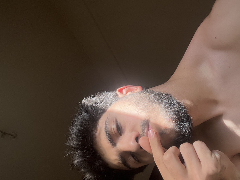 An image depicts a young adult male, shown from the chest up, positioned indoors