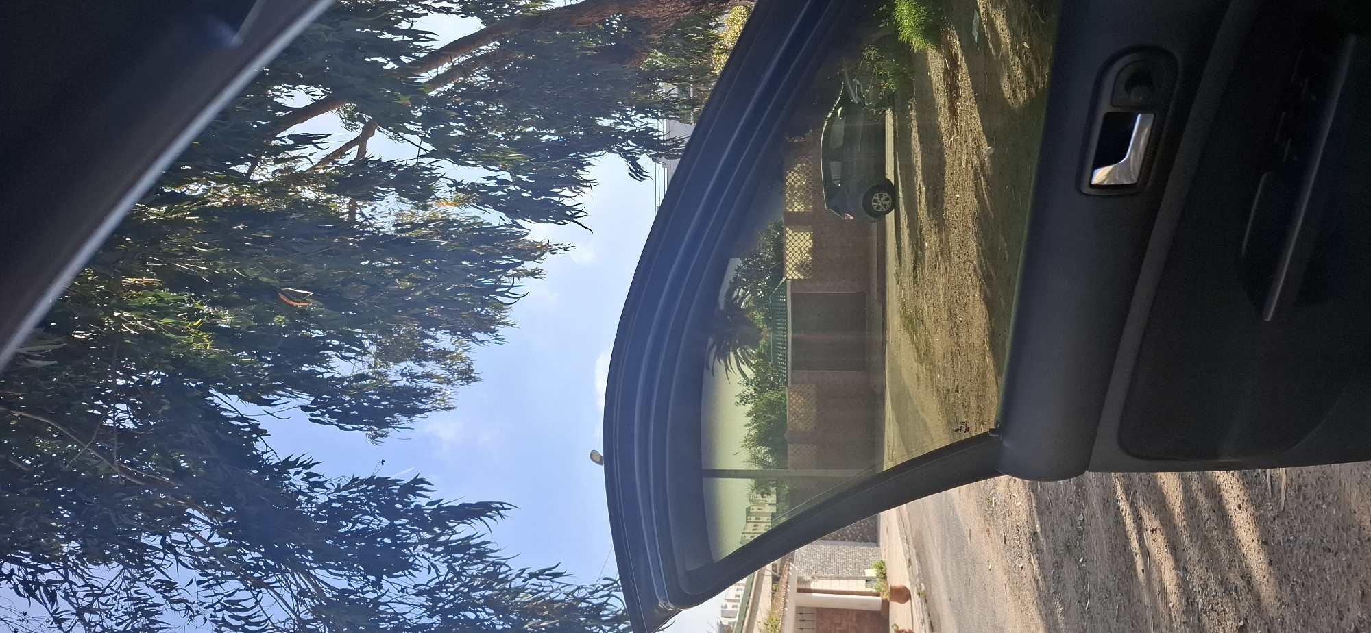 The image presents a daytime scene captured from the interior of a vehicle in a residential area of Rabat, Morocco. The foreground prominently features the dark plastic interior panel of a car door, including a chrome door handle and power window controls on the lower right. A partially lowered, tinted window of the vehicle is visible, framing the exterior view. Outside the vehicle, a dusty, unpaved road or path is visible on the left, receiving dappled sunlight and shadows from overhead foliage. Adjacent to this path, a light-colored residential building with a patterned wall and a reddish-brown tiled archway is partially visible. To the right, a dark-colored hatchback car is parked on an uneven, dry dirt lot with scattered green patches. Behind this lot, a sturdy brown wall with a decorative lattice top runs horizontally, partially obscuring a building with a distinctive green tiled roof. In the far distance, taller multi-story residential buildings are discernible under a bright blue sky. The upper portion of the frame is dominated by the dense canopy of large trees, characterized by long, slender leaves, likely eucalyptus, casting prominent shadows across the ground. A palm tree is also visible amongst the background vegetation. The sky is largely clear blue with minimal cloud cover, indicating sunny weather. No individuals are present in the scene.
