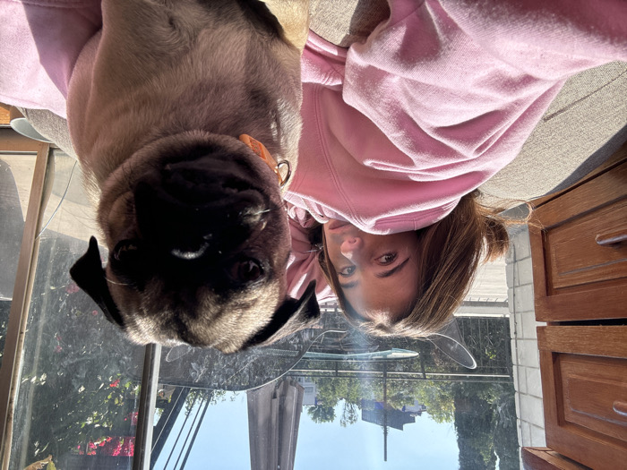- "A woman in a pink hoodie poses upside down with a pug" by FM-rJJmw2, licensed under CC BY 4.0
