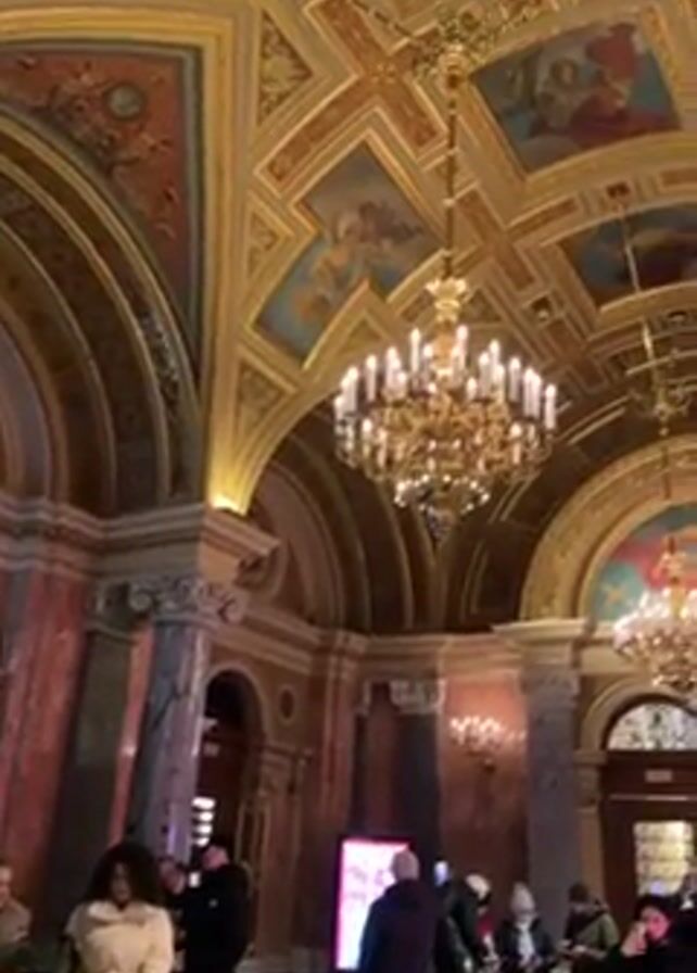 n ornate interior space with a high, coffered ceiling decorated with paintings and gold trim. Large crystal chandeliers hang from the ceiling. The walls are adorned with marble and detailed architectural elements. Several people are present, standing and conversing, some wearing coats. The camera pans upwards, focusing on the ceiling and its intricate details.