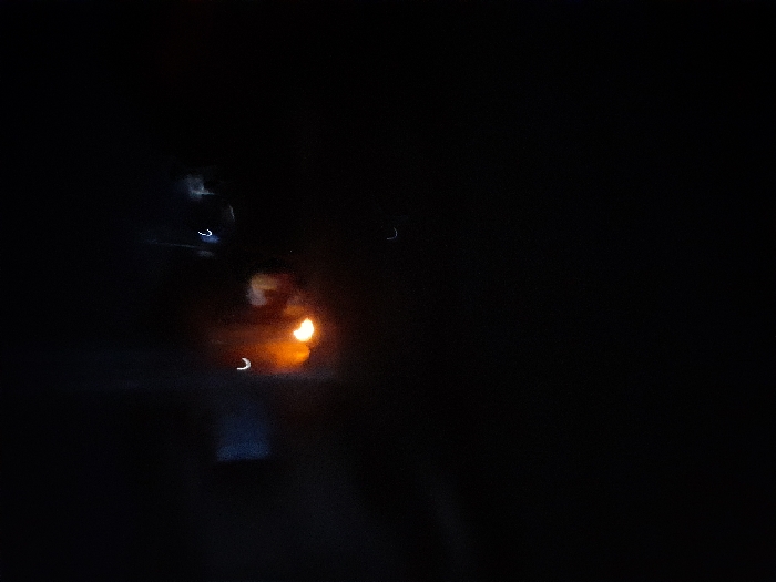 An indistinct image features blurred lights against a deep black backdrop. An orange, hazy glow suggests a flame or strong light source. Streaks and indistinct shapes of light, varying from white to blue, are scattered around the central orange area. The image appears to have been captured in low light conditions, resulting in the blurring and smudging of visual elements.