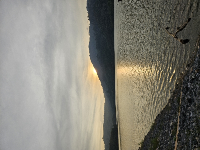 The image depicts a tranquil outdoor landscape at sunrise or sunset in Kathu, Thailand. A vast body of water, likely a reservoir or lake, occupies the lower two-thirds of the frame, with its surface showing numerous ripples. A bright golden sun is partially visible just above the distant, dark, densely forested hills that stretch across the horizon. The sun casts a prominent, elongated golden reflection directly across the water towards the viewer. The sky above is overcast, filled with grey and white stratocumulus clouds, transitioning to a warmer yellow-orange tint near the horizon where the sun is located. In the immediate left foreground, a rocky embankment, composed of various sized grey stones and sparse dry vegetation, borders the water. A large, dark, gnarled tree branch is partially submerged in the water in the lower right foreground. No individuals, structures (apart from potentially a distant marker in the water on the far right), or discernible actions or interactions are present.