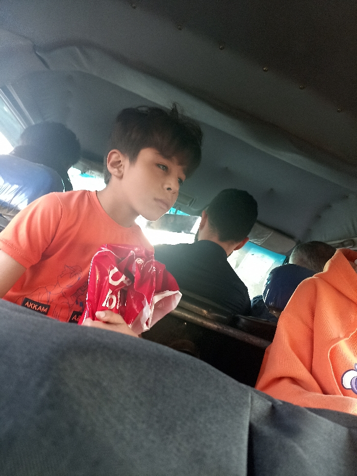 The image depicts the interior of a passenger vehicle in Mu'adammiyat ash-Sham, Syria, during daytime. A young male, approximately 8-12 years old, is seated in the foreground, wearing an orange short-sleeved t-shirt with a visible "AKKAM" graphic on the lower left front. He holds a crumpled red and white plastic bag, displaying faint white text that includes "LOLLO", in his right hand. His head is turned slightly to the right, eyes gazing outward with a neutral expression. The lower left foreground shows his upper legs, clad in dark trousers. In the middle ground, the backs of three other individuals are visible. To the far left, a person with dark, voluminous hair wears a blue garment. Centrally, an adult male with short dark hair wears a black shirt, facing away from the camera. To the right, another person wearing an orange hooded garment is partially visible. The vehicle's ceiling is dark grey with visible fasteners. Bright daylight illuminates the scene from windows in the background, creating some glare and indicating daytime conditions. All individuals appear to be passengers in transit.