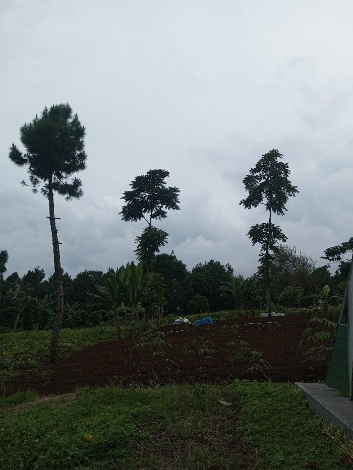 The scene is an outdoor agricultural landscape situated in Abbireddygudem, India. The sky is uniformly overcast with a grey cloud cover. In the immediate foreground, a strip of unkempt green grass occupies the lower left, transitioning into a section of dark brown, freshly tilled earth. Small, nascent green plants are scattered within this tilled area. A concrete structure, featuring a green upper facade, is partially visible along the extreme right edge. The midground is dominated by a cultivated field of dark brown soil, exhibiting multiple rows of low-lying green vegetation. Interspersed within this field are several taller, broad-leafed plants, consistent with banana trees. Two white bags and a single blue tarp are laid directly on the soil in the central-right portion of the midground. The background consists of a dense, dark green canopy of trees, forming a distant treeline. Three prominent, slender trees stand vertically against the sky: a conifer with dark green needle-like foliage on the left, displaying several small, dark horizontal attachments along its trunk; and two taller deciduous trees positioned centrally and to the right, each characterized by dense, dark green crown foliage. No human figures or discernible actions are observed within the frame.