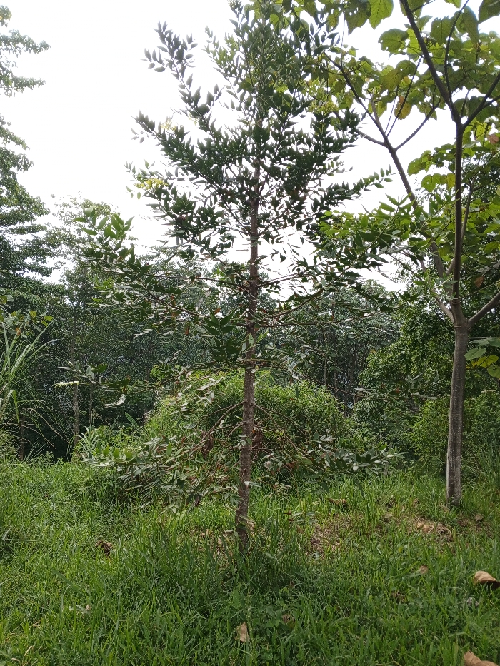 The scene depicts a dense, natural vegetative area in Thotagamuwa, Sri Lanka, under an overcast sky. A slender tree, approximately 3-4 meters in height with a dark brown, vertically textured trunk and numerous small green leaves, stands prominently in the foreground, slightly left of center. The ground is covered with thick, unkempt green grass, with some dried brown leaves scattered across its surface, notably on the right side. To the immediate right of the central tree, a portion of a thicker tree trunk with lighter bark is visible. The midground and background consist of a layered expanse of various tropical trees and shrubs, forming a dense, dark green canopy. Tall, broad-leafed plants are discernible on the far left. No individuals, animals, or man-made structures are present within the frame. The lighting is uniform and diffused, indicative of an overcast sky.