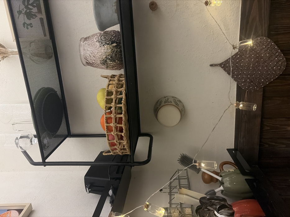 A metal shelf displays a variety of items, including dishes, a decorative vase, and a wicker fruit basket containing a pear and oranges. The shelf is positioned against a white wall adorned with a cup, oven mitt, and string lights with decorative bottles. In the foreground, kitchen utensils and cookware rest on a rack, illuminated by additional string lights. Wooden paneling is visible on the right side of the frame.