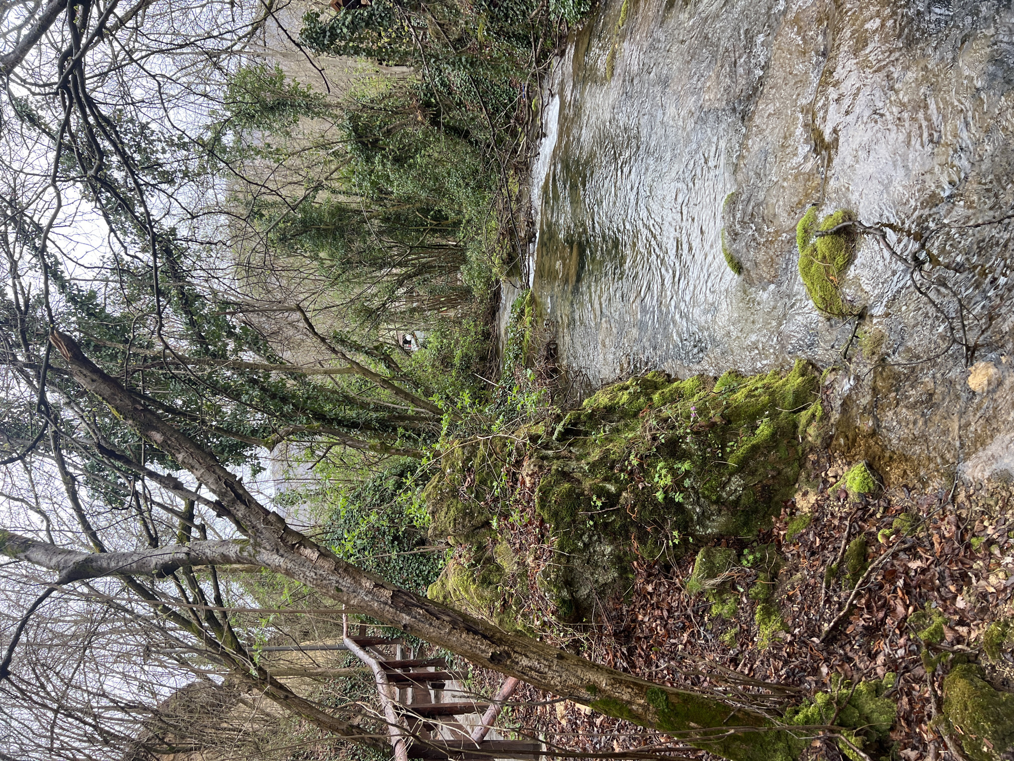 The image captures a forested stream environment in Despotovac Municipality, Serbia, under an overcast sky. A clear, shallow stream occupies the right half of the frame, flowing from the background towards the foreground, its surface rippled and reflecting diffused light. Moss-covered rocks and submerged stones are visible within the streambed and along its banks. On the left bank, a wooden handrail or fence is partially visible, indicating a pathway or bridge. The ground in the foreground on this side is covered with a dense layer of brown fallen leaves, small branches, and patches of vibrant green moss. Several trees with bare, deciduous branches and trunks, some covered in moss and lichen, rise from the left bank. A prominent tree in the mid-left features light-colored, peeling bark. The right bank and background are densely vegetated with a mix of deciduous trees, many bare, and evergreen foliage, including significant growth of ivy climbing tree trunks and covering undergrowth. Fallen tree branches are scattered across the water and along the banks. In the distant background, faint, indistinct structures are partially visible through the dense tree cover. No human or animal subjects are present within the scene.
