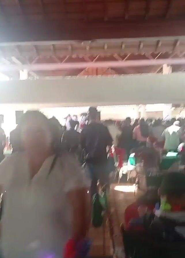 busy, festive gathering of people under a covered, open-air structure with a wooden ceiling. Numerous individuals, varying in age and attire, are visible. Some are walking around, others are seated at tables covered with colorful cloths, and some are standing, possibly conversing or watching an event out of frame. The atmosphere appears lively, with music playing in the background. Bright sunlight floods the area beyond the covered space, suggesting an outdoor setting. The scene suggests a celebration or community event.