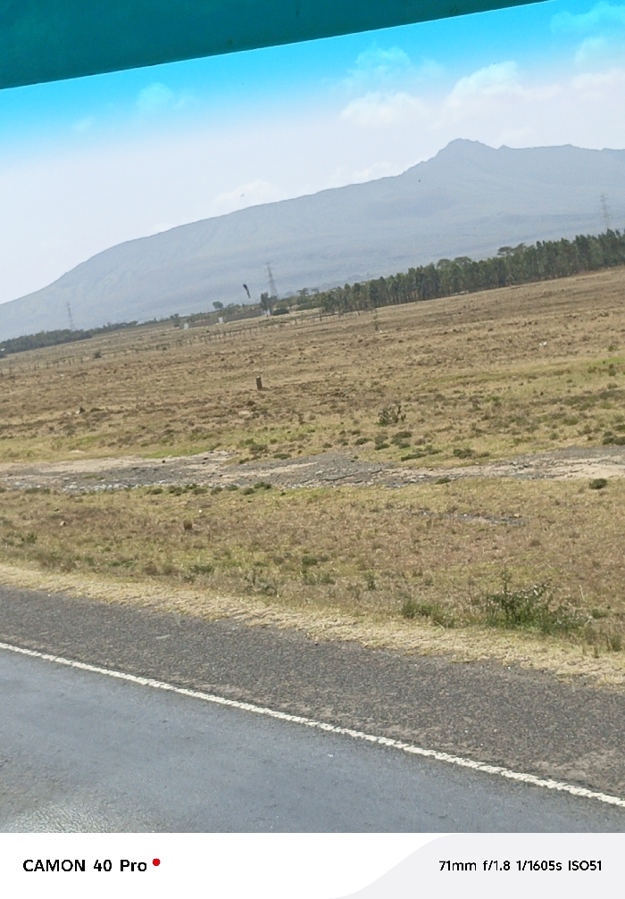 A daytime view shows a road with a white line marker. Adjacent to it is dry grassy terrain with scattered bushes, leading up to a distant row of trees. Further in the background is a mountain obscured by a haze. Power lines are visible across the field. The camera's lens and settings, and a brand logo are displayed at the bottom. The upper portion of the frame is tinted blue.
