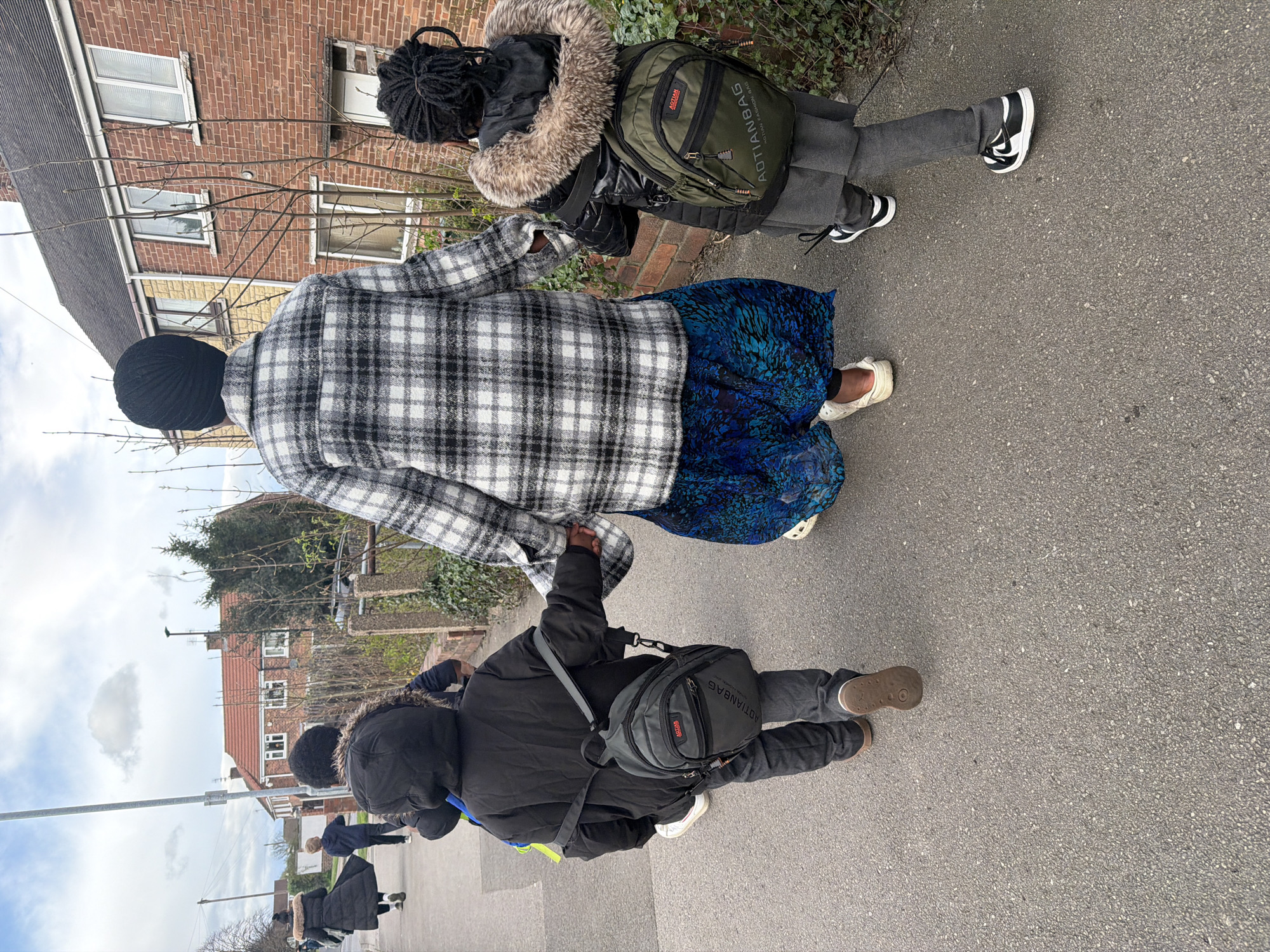A group of five individuals, comprising two adults and three children, walk in a line along a grey asphalt pavement on a residential street in Rotherham, United Kingdom, under an overcast sky. In the foreground, an adult, seen from behind, wears a black turban, a black and white plaid long-sleeved jacket, a long blue patterned skirt, and off-white clogs. This adult holds hands with two children, one on each side. The child to the adult's left wears a black hooded puffer jacket, dark trousers, and brown shoes, carrying a grey "AOTIANBAG" backpack. The child to the adult's right wears a black fur-lined hooded puffer jacket, grey trousers, and black and white Nike sneakers, carrying an olive green "AOTIANBAG" backpack. Further ahead on the pavement, a second child, wearing a dark blue hooded jacket and dark trousers, walks in front of the primary group. Behind this child and further to the left, a second adult wears a long black coat with a fur-lined hood and dark trousers. The environment consists of red brick terraced or semi-detached houses with white window frames and dark roofs, visible along the right side of the street. Bare deciduous trees and sparse vegetation line the property boundaries. A grey street light pole stands on the left side of the pavement.