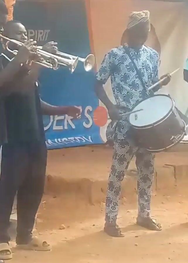 live musical performance, likely outdoors. Two young men in casual clothing play trumpets, while two older men in traditional attire play drums. The musicians stand on a dirt ground in front of a tent with a banner visible in the background that reads "SPIRIT UNDER'S." The scene is shot from a static position.