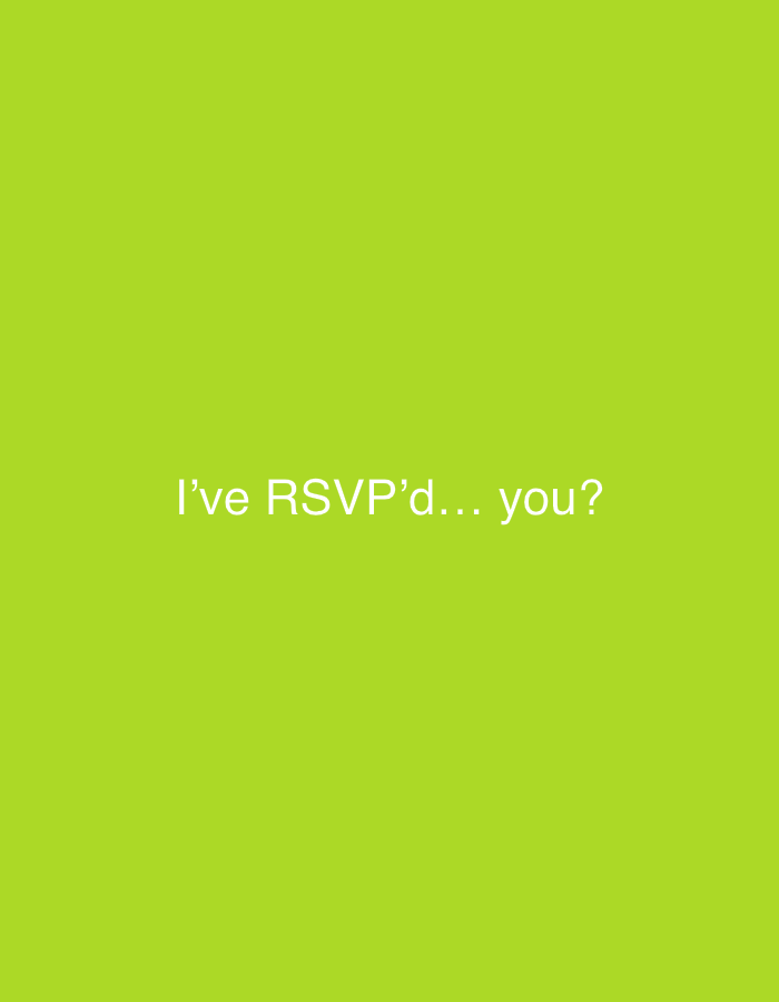 Described within the context of Garston, United Kingdom, the image displays a uniform, vibrant lime green background. White sans-serif text, centrally positioned in the lower portion of the frame, reads: "I've RSVP'd... you?". No people, subjects, objects, actions, or interactions are visible. The environment is an abstract, single-color field with overlaid text.