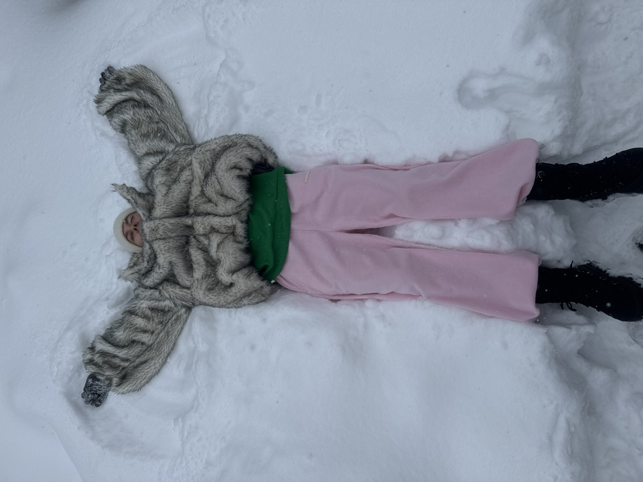 - "A single individual lies supine in deep, fresh snow, with their arms extended upwards and outwards, and legs straight, forming the outline of a snow angel" by FM-j2hvk2, licensed under CC BY 4.0