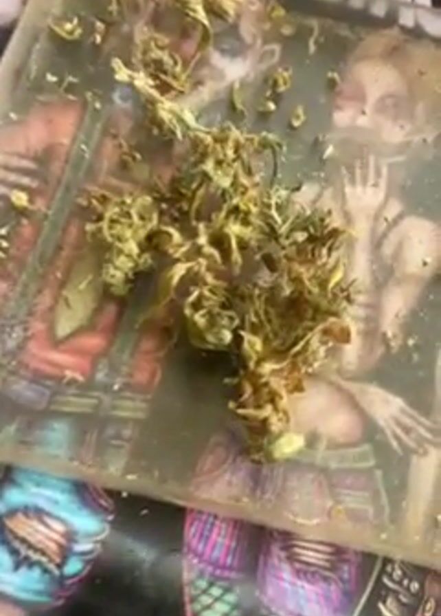 close-up of a transparent tray on top of a Rolling Circus rolling tray. The transparent tray contains fragmented plant material, predominantly light green and yellow in color. The material appears dry and loosely clustered. The underlying rolling tray displays a colorful graphic of figures with skeletal features, wearing eclectic clothing. A blue object is partly visible on the left side of the tray. The camera zooms into the plant material, causing it to become slightly blurred.