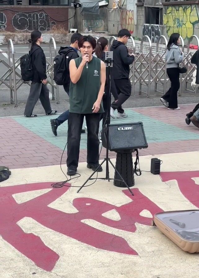 A young man is busking on a city sidewalk. He’s wearing a sleeveless green shirt, black pants, and black shoes, and he’s standing on a square painted with a red and white graphic. He’s holding a microphone, singing into it, and has a small speaker and an amplifier on a stand next to him. Several pedestrians walk by, some looking at him, one filming him with a phone. The background includes buildings covered in graffiti and a metal barricade. The weather appears to be overcast.