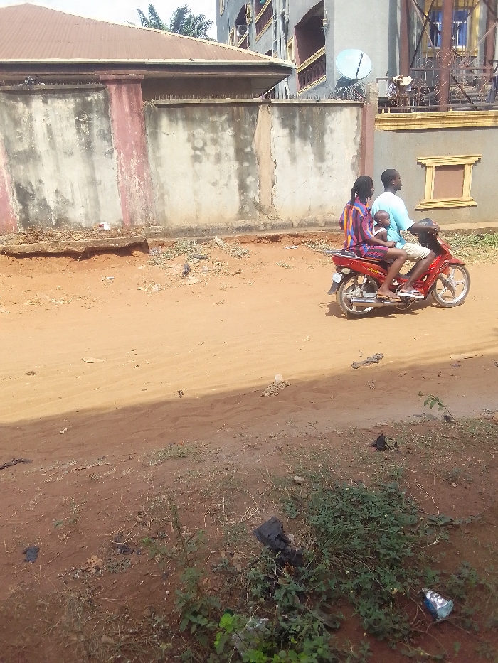 This image captures a daytime scene on an unpaved, reddish-brown dirt road in Ukwu-Abwa, Nigeria