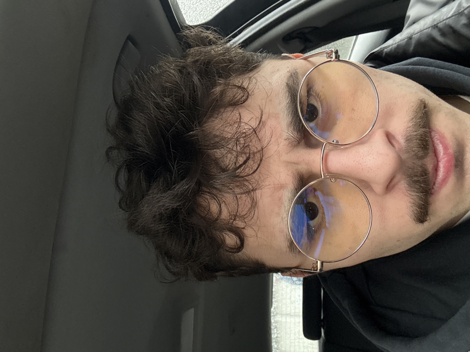 A man with curly brown hair and a mustache is captured at a close angle. He wears round-rimmed glasses, and his eyes are visible through the lenses. The reflection in the glasses shows a blue hue. He is wearing a dark hooded sweatshirt. The background consists of the interior of a car, including the ceiling and a window, creating a sense of being inside a vehicle. The overall lighting is slightly dim.