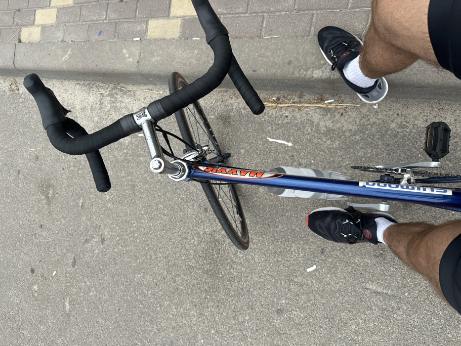 - "An overhead, slightly angled view captures the lower body of an individual standing with a blue road bicycle" by FM-Qm3Z63, licensed under CC BY 4.0