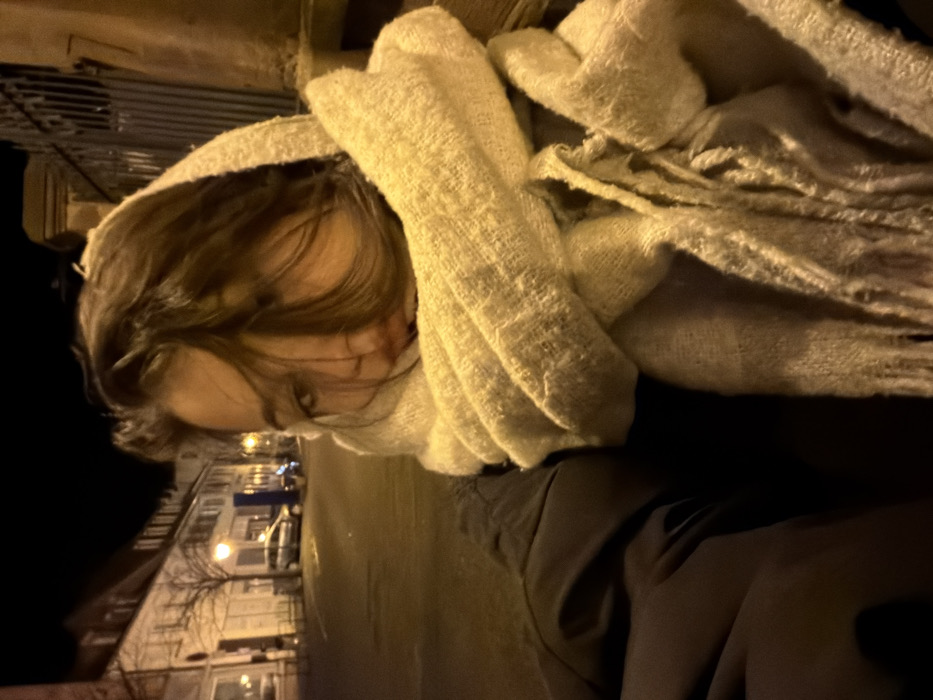 A person with brown hair wears a thick, cream-colored scarf draped around their head and neck. The scarf has a textured, loose-knit appearance. The person is wearing a dark-colored coat or jacket. In the background, blurred lights from street lamps and buildings suggest an urban setting at night. The image is slightly tilted, and the focus is primarily on the person's face and the scarf.