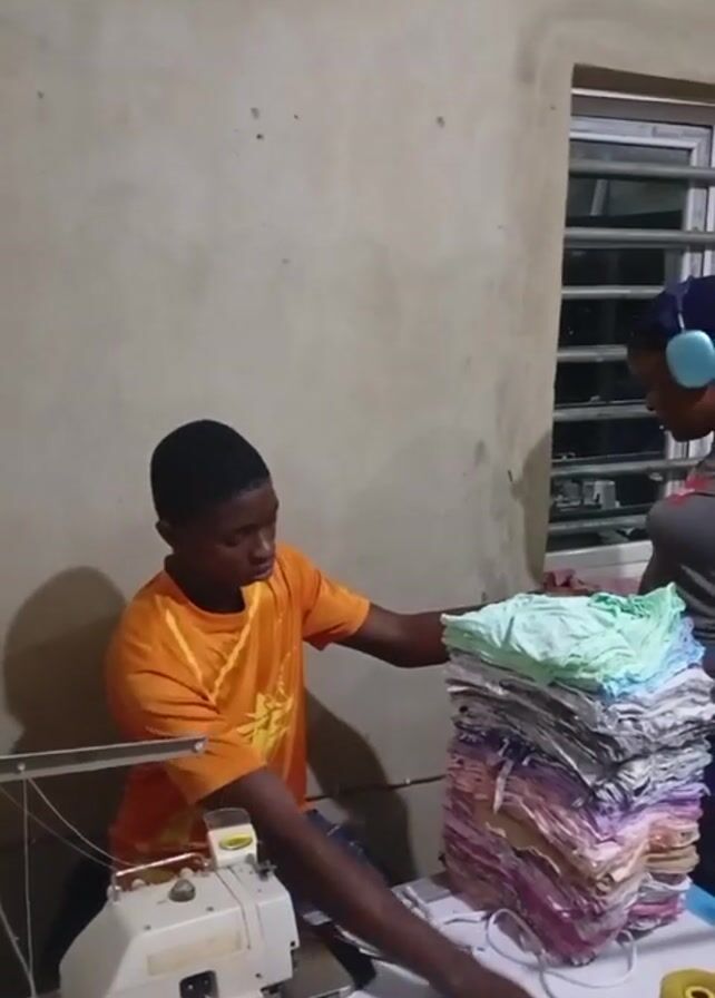 Two people are in a room with a sewing machine. A young man wearing an orange t-shirt sits at a table with the sewing machine, working with a large stack of colorful fabric pieces. Next to him stands a woman with headphones and a blue head covering, looking at the stack of fabric. The room has white walls and a window with blinds. There are spools of thread and other sewing supplies on the table.
