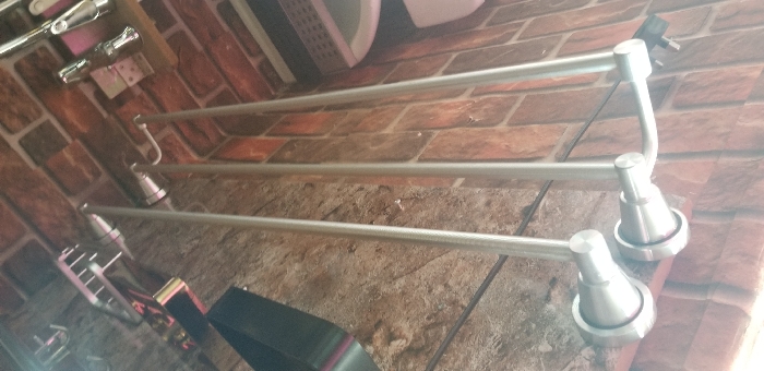 The image displays a three-tier, brushed metal towel rack mounted on a wall featuring red and brown brick-patterned wallpaper or paneling with white mortar lines. The towel rack comprises three parallel horizontal bars supported by two vertical arms, each topped with a cylindrical finial. A J-shaped hook is attached to the lower right bar. Below the towel rack, a section of a white or light-colored ceramic fixture is partially visible, alongside an assortment of chrome-plated plumbing fixtures and hardware resting on a surface to its right. A dark, angled object with a thin colored stripe is present in the upper right background. No individuals are depicted. The scene is an interior room located in the city of Unknown, Unknown.