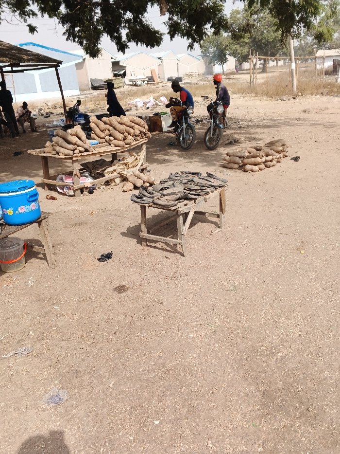 The image displays an outdoor market scene in Ado, Nigeria, under daylight conditions. The ground is unpaved, consisting of dry, light-brown soil with sparse vegetation and scattered debris. In the foreground, two wooden tables serve as commercial displays. The left table is laden with numerous large yams, with additional yams and items visible beneath it. To the left of this table, a blue cooler with white floral patterns rests on a small wooden stool, adjacent to a red bucket. The right table is covered with multiple dark-colored, open-toed footwear items, likely sandals or slippers. A stack of yams is also arranged directly on the ground to the right of this table. Several individuals are present within the scene. On the far left, beneath a dark-roofed, makeshift wooden shelter, three men are seated, partially obscured, and one person in a dark garment stands near the yam display. In the midground, two men are mounted on motorcycles; one wears a blue and red top with a red helmet, the other a dark top with a dark helmet. The background features multiple single-story buildings with light-colored walls and blue roofs, suggesting residential or commercial structures. Dry trees and scrubland extend further into the distance.
