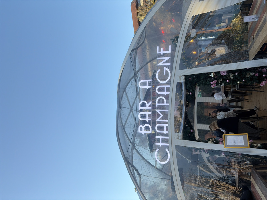 A low-angle shot captures a dome-shaped structure with "BAR A CHAMPAGNE" vertically displayed in white lettering. The structure's transparent walls reveal people seated inside, surrounded by floral decorations. A framed sign stands near the entrance. The blue sky fills the left side of the image, contrasting with the structure's dome.