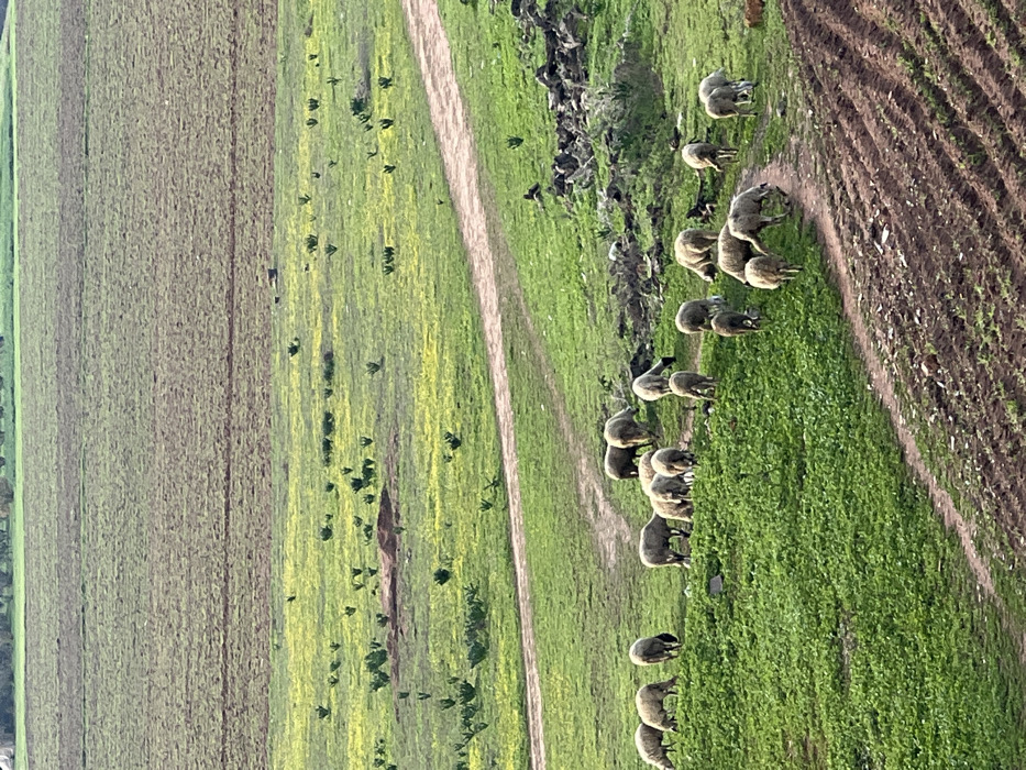 An outdoor scene captured from a high vantage point displays an agricultural landscape on the outskirts of Salé, Morocco. The foreground on the lower right shows an area of recently tilled brown soil with distinct parallel furrows. This cultivated land transitions into a vast green field occupying the midground, where patches of yellow flora are scattered. A light brown dirt path curves through this green field, with a less defined branch appearing to converge with it from the left. A flock of approximately 20-30 sheep, primarily light-colored with some darker facial or leg markings, are dispersed across the lower and mid-sections of the green field, actively grazing. To the right of the sheep, an area contains dark, fragmented debris or rocks. In the upper-middle section of the green field, a small, darker mound of earth is visible. The background consists of a large, flat expanse of brown, unplanted earth, extending to a faint green line at the horizon, indicating distant vegetation. The scene is illuminated by natural daylight.