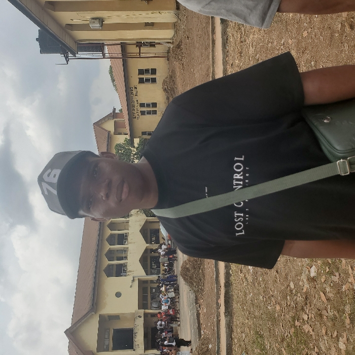 An outdoor scene depicts a young male subject in the foreground against the backdrop of a university campus environment in Ihiagwa, Nigeria
