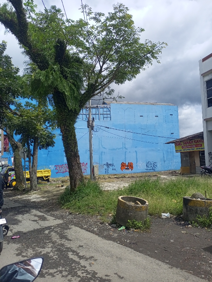 A partly cloudy day captures a blue, cracked building with graffiti. A large tree dominates the view, partially obscuring the building. An adjacent white building is visible to the right. In the foreground, sections of asphalt road with some concrete rings along the side and weeds are visible. A yellow truck parked nearby suggests a roadside scene. The image exhibits a blend of urban decay and nature.