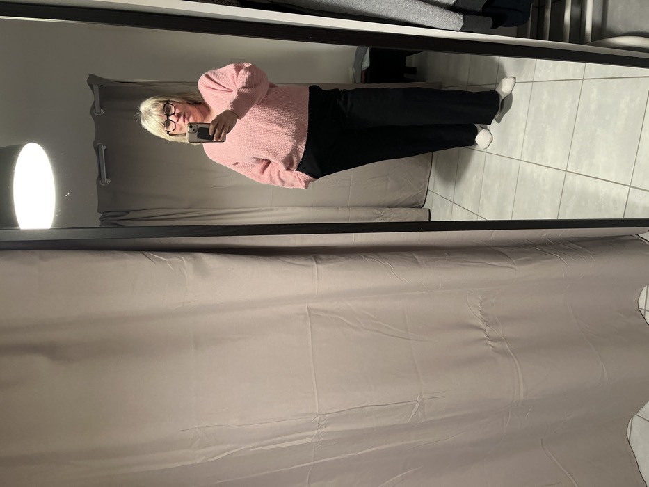 A woman with blonde hair and glasses is seen in a mirror, wearing a pink sweater and black pants