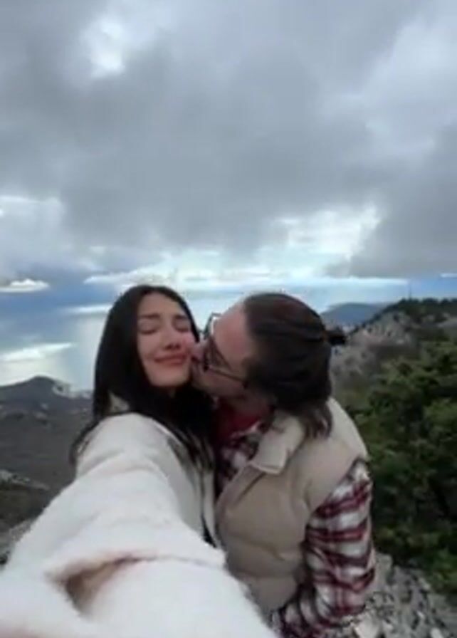 A young couple takes a selfie on a rocky mountain peak overlooking the sea. The woman, on the left, has long dark hair and wears a white, textured jacket. The man, on the right, wears sunglasses, a beige vest, and a plaid shirt. He has long hair pulled back in a bun. The sky is overcast, and the background features an ocean view, rocky terrain, and sparse vegetation. The man kisses the woman's cheek.