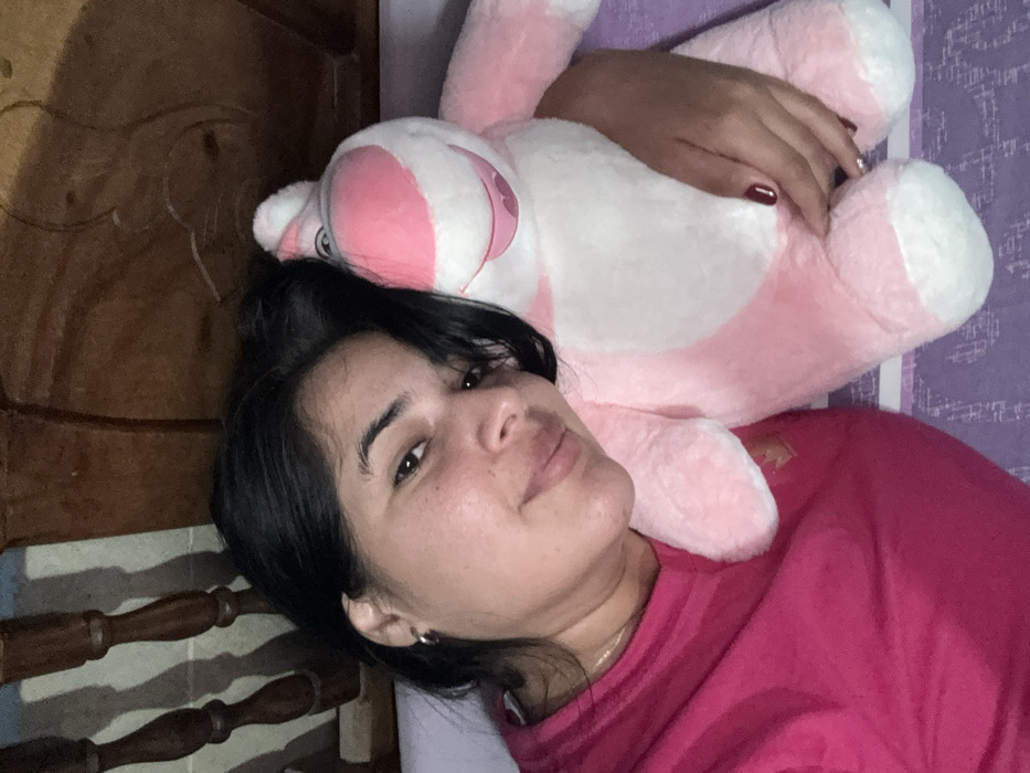The image displays a female subject in an indoor environment. The specific location within Altagracia, Venezuela, cannot be determined from the visual information. The subject, an adult with dark hair and light skin, occupies the foreground, looking towards the viewer with a slight smile. She is wearing a solid magenta-pink top and a small silver hoop earring on her visible left ear. She is embracing a large, plush toy, predominantly pink and white, resembling the Pink Panther character, positioned to her right. Her right hand, exhibiting dark red nail polish, is wrapped around the stuffed animal. The background reveals a dark wooden structure with carved details on the upper left, consistent with furniture such as a headboard. A patterned textile in shades of purple and white is visible on the lower right, suggesting bedding or upholstery. The lighting indicates an interior setting.