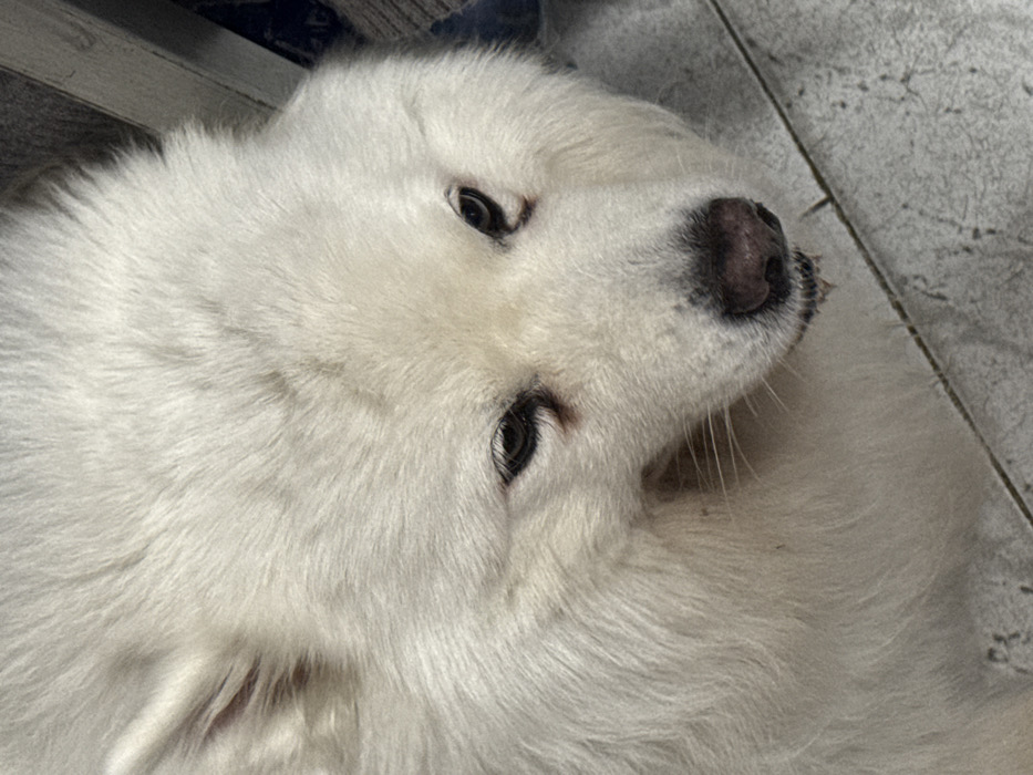- "The image displays a close-up, high-angle view of a large domestic canine, likely a Samoyed or similar breed, characterized by dense, fluffy white fur" by FM-PDjLC3, licensed under CC BY 4.0