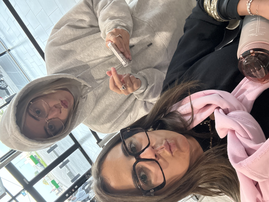 The image depicts two women posing indoors, likely within a public building such as Lyon-Saint Exupéry Airport, located in Colombier-Saugnieu, France. In the foreground, a woman with long, dark brown hair wears large, square-framed tortoiseshell eyeglasses. She is dressed in a black long-sleeved top with a light pink garment draped around her neck. Her right arm is adorned with multiple bracelets, including gold-toned bangles, a dark wristband, and a beaded bracelet. She holds a light-colored water bottle with a copper-toned lid and straw. Her lips are pursed in a "duck face" expression, directed towards the camera. Positioned behind and to the right, a second woman with blonde hair is visible beneath a light gray hooded sweatshirt, hood up. She wears lighter-framed eyeglasses and also has her lips pursed in a "duck face" expression. Her left hand, featuring a ring with a dark stone, gestures towards a small, white, rectangular object held in her right hand. Additional rings are visible on her fingers. The background consists of large, clear glass windows, revealing an outdoor scene. A paved area is visible, with a white car partially parked. Distant green foliage and another individual in a light-colored hooded top can be faintly observed through the windows. The interior floor appears to be light-colored tile.