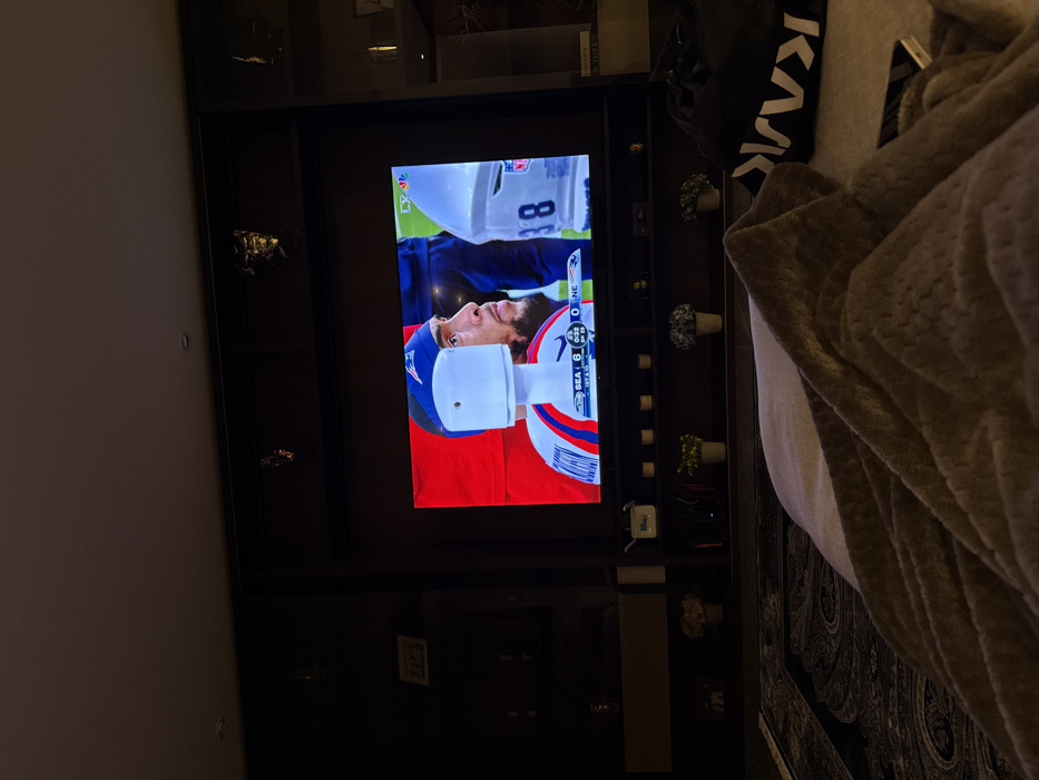 A television displays a football game, showing a player in a red, white, and blue uniform with the game score visible. The TV is part of a built-in entertainment center with shelves. A blanket and possibly part of a bed are visible on the right side of the image, suggesting a comfortable viewing environment. The room appears to be dimly lit.