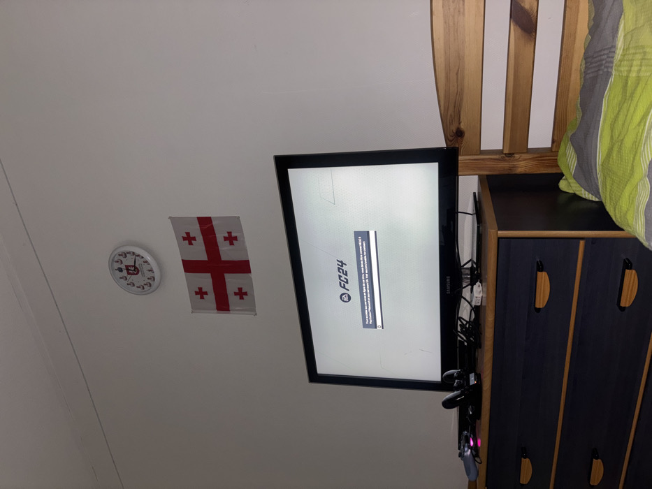 A wall-mounted TV displaying the game FC24 sits next to a dresser. To the left, a wall clock and a Georgian flag are visible. Controllers dangle behind the TV. The dresser is made of dark wood with light wood handles. A wooden bed frame and a striped green and gray blanket are beside the dresser. The wall is a light color.