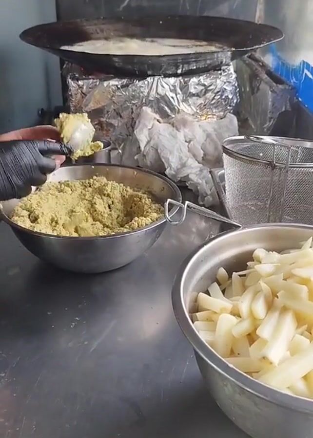 - "A person wearing black gloves is using a spoon to place dollops of green mixture from a metal bowl into a large, flat wok filled with bubbling oil" by FM-sbnkb2, licensed under CC BY 4.0