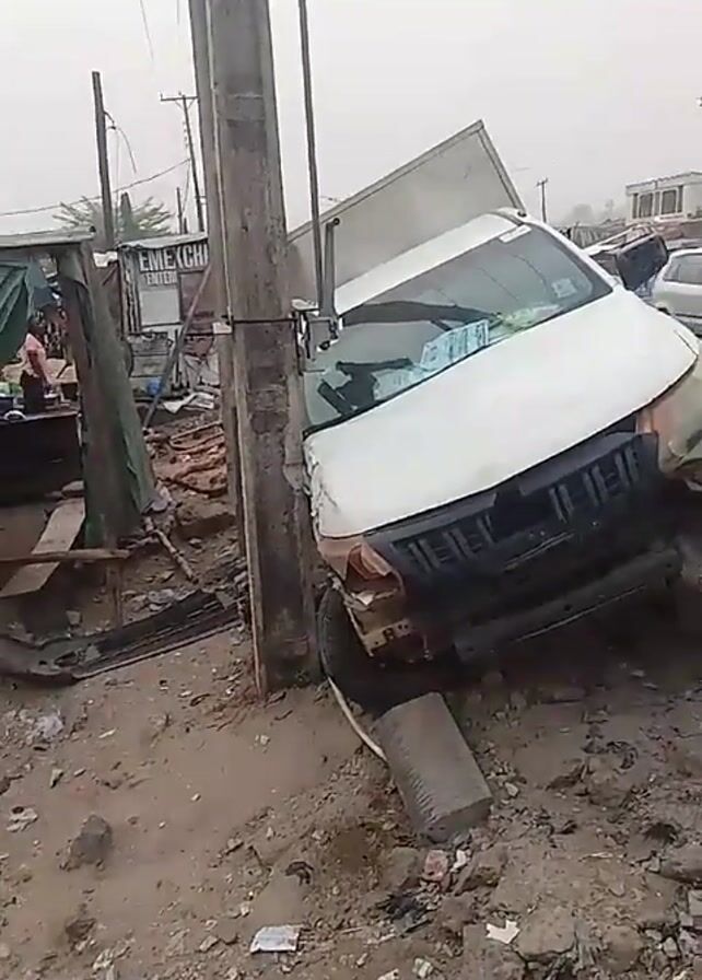 A white van with a cargo box has crashed into a utility pole on the side of a road. The front of the van is severely damaged. The van is resting on a concrete block. Debris is scattered around the vehicle. Other vehicles and buildings are visible in the background. The sky is overcast.