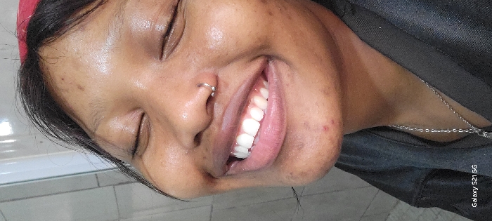 A close-up shot captures a smiling woman with closed eyes. She has a nose ring and white teeth. Her skin appears slightly oily. The subject wears a dark garment partially visible, adorned with a silver chain necklace. The background includes a section of white tiled wall. A smartphone logo is visible in the lower right corner.