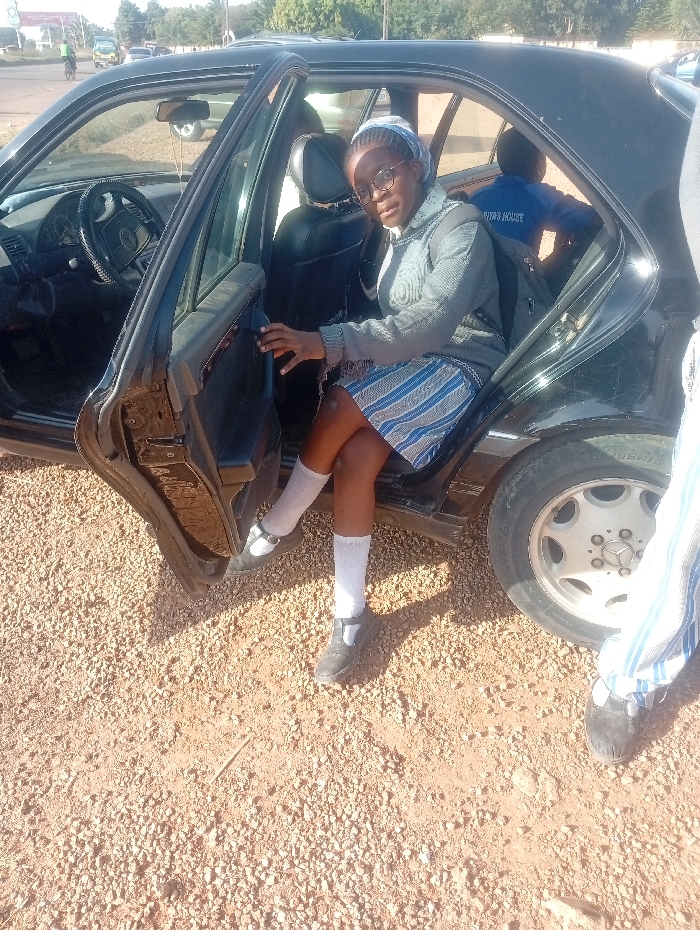 A young female is seated in the rear passenger side of a black Mercedes-Benz sedan with the door open, positioned on a reddish-brown gravel and dirt shoulder in Kakuri Gwari, Nigeria